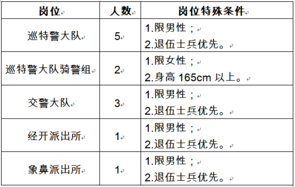 本次招聘崗位為祥云縣公安局巡特警大隊(duì)、交警大隊(duì)、經(jīng)開派出所、象鼻派出所警務(wù)輔助人員,用工形式為勞務(wù)派遣,主要工作職責(zé)為協(xié)助民警完成各項(xiàng)工作;本次招聘的警務(wù)輔助人員不納入編制管理,不具有人民警察和國家公務(wù)員身份,不行使人民警察職權(quán)。本次共計(jì)招聘警務(wù)輔助人員12名。其中巡特警大隊(duì)7名(男性5名,女騎警2名)、交警大隊(duì)3名、經(jīng)開派出所1名、象鼻派出所1名。具體招聘崗位、人數(shù)如下:
