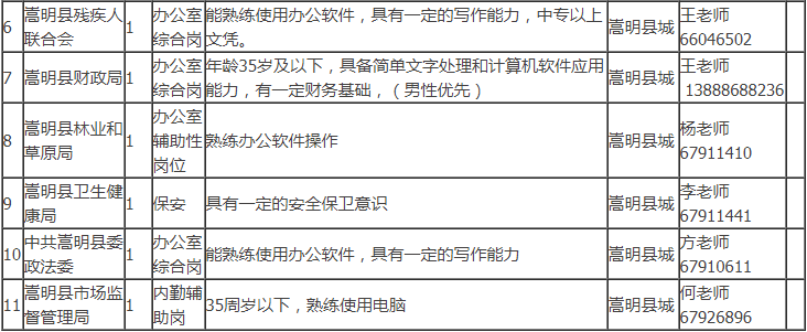 招聘具體事宜請咨詢用人單位,符合公益性崗位上崗條件的個(gè)人也可以到嵩明縣勞動就業(yè)服務(wù)局綜合科申請公益性崗位求職登記,詳詢陳老師:0871-67917444。