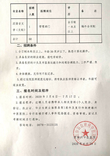 楚雄州中醫(yī)醫(yī)院2020年第一批招聘公告