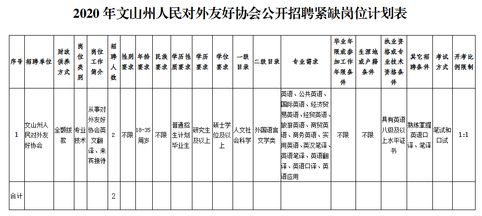 本次招聘崗位為文山州人民對(duì)外友好協(xié)會(huì)英語(yǔ)翻譯,招聘人數(shù)2人,負(fù)責(zé)友好協(xié)會(huì)具體工作,兼顧外事工作,具體崗位、人數(shù)、資格條件等詳見下表。