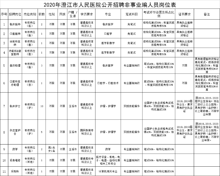 澄江市人民醫(yī)院2020年度面向社會(huì)公開招聘非事業(yè)編制工作人員38名。現(xiàn)將第一批招聘28名工作人員有關(guān)事宜公布如下: