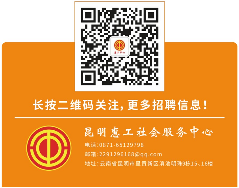 本公告最終解釋權(quán)歸昆明惠工社會(huì)服務(wù)中心所有,后續(xù)招聘相關(guān)信息請(qǐng)關(guān)注“惠工中心”微信公眾號(hào)。